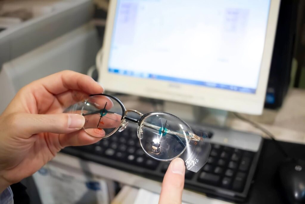 そして、多焦点レンズを使う上で命とも言えるのが、お顔に合わせた調整(フィッティング)です。 多焦点レンズは、見る位置によって度数が変わる精密な作りをしています。そのため、メガネが鼻から少しズレ落ちているだけでも、本来の「見えるポイント」から外れてしまい、「見えにくい」「クラクラする」という不快感につながります。
