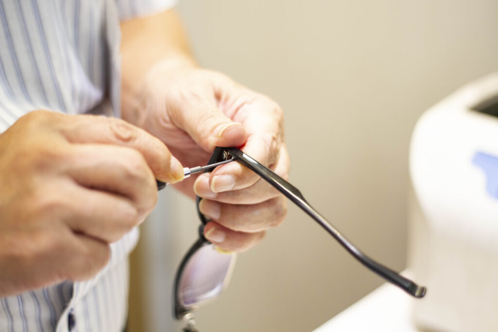 そして、どんなに素晴らしいレンズを使っても、お顔の正しい位置に収まっていなければ100パーセントの力は発揮できません。お一人おひとりの耳の高さ、お鼻の形、骨格や視線の癖に合わせた「1ミリ単位の緻密な調整(フィッティング)」こそが、見え方と疲れにくさを左右する最も重要な技術です。メガネのタナカヤでは、お顔に乗せた瞬間に「あ、軽い」と感じていただけるような、優しく寄り添うフィッティングを心がけております。